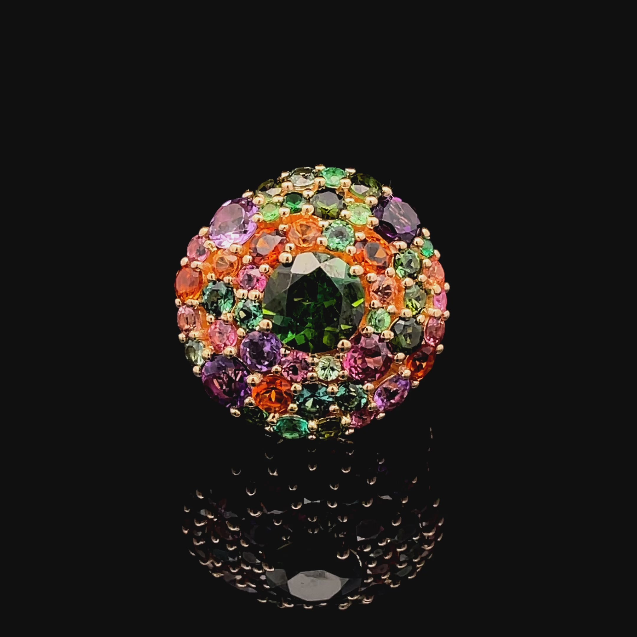 Another spot on colour combo in the next DB referring to the magic of astronomy. Here with a Verdelite tourmaline round star, surrounded by its orange/green/pink/purple planets and baby moons. Precious and semi-precious content. A Kimball statement. Yellow gold 18kt.
