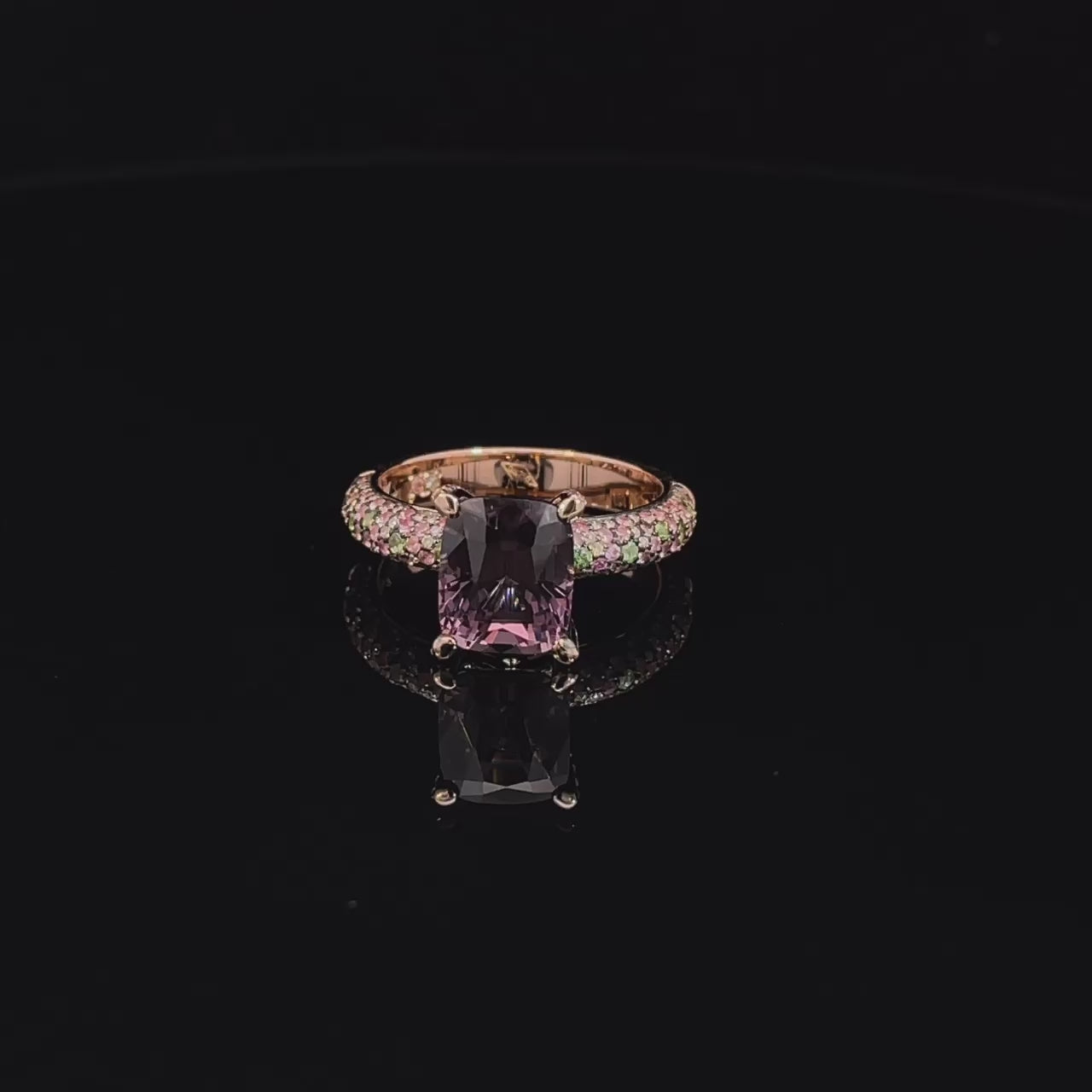 AA grade aubergine spinel cushion. Tsavorite, white diamonds and pink corrundum in shank. Pink gold 18kt. Black Rodium. Top modern.