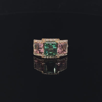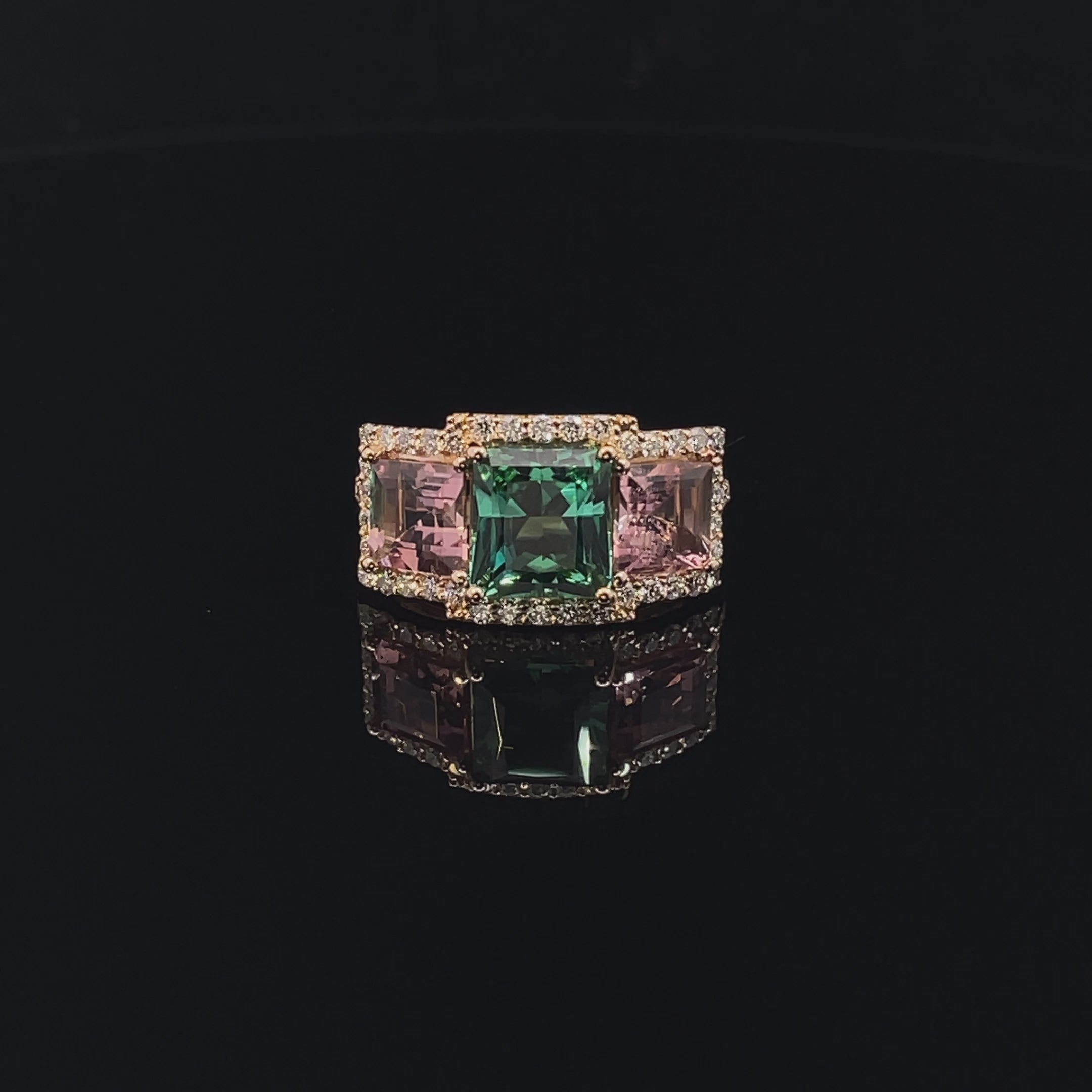 Princess cuts trilogy. AA grade green tourmaline and morganite beryls. FG vs natural diamond finish. 18 kt pink gold.