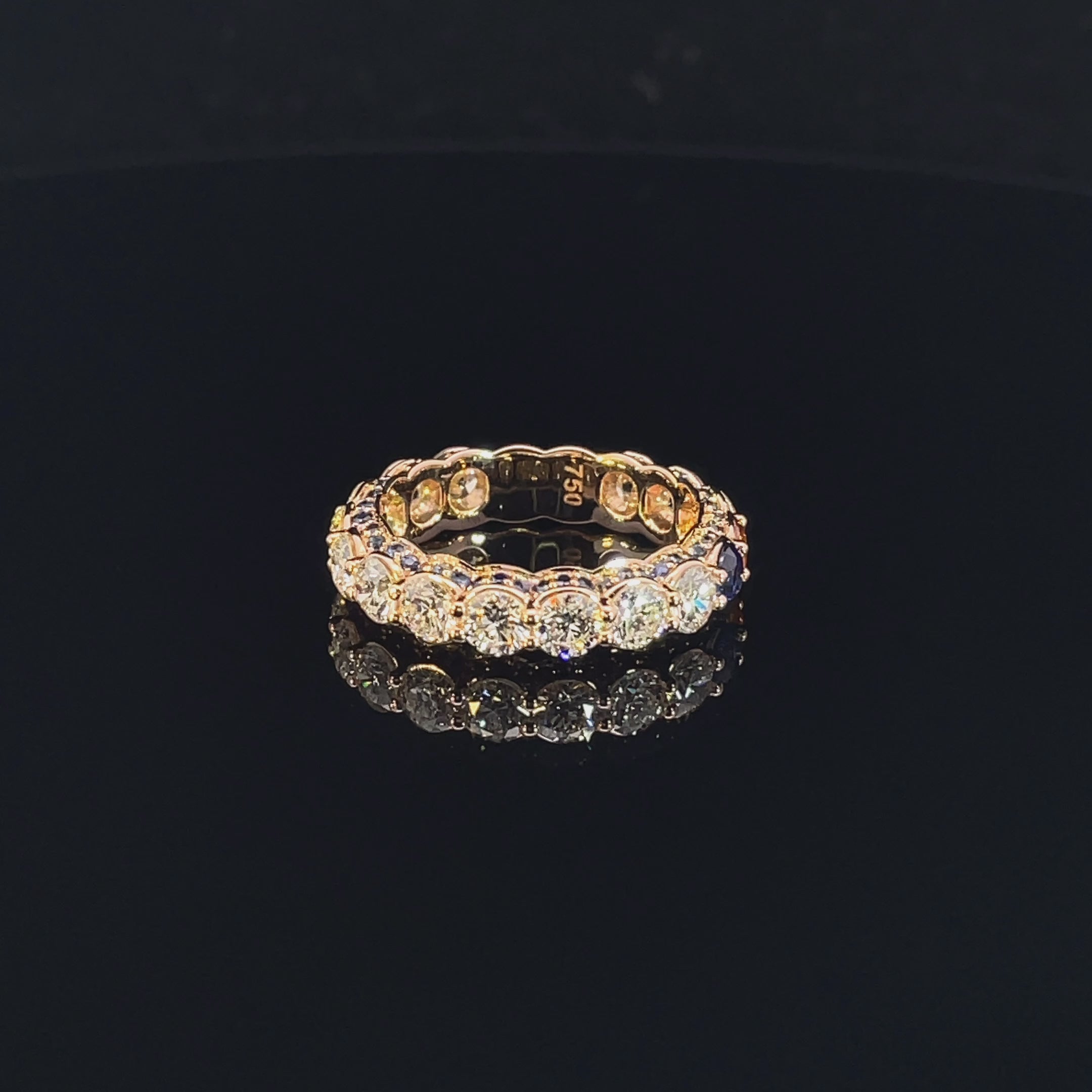 1/6 natural round brilliant diamonds FG SI1 of with an average of 3.4 mm (0.15cts pp). Two colour sapphire finish. Pink gold 18 kt. Prices on request according to ring size. Also avaible with larger diamonds upto one carat per piece, even in fancy shapes.