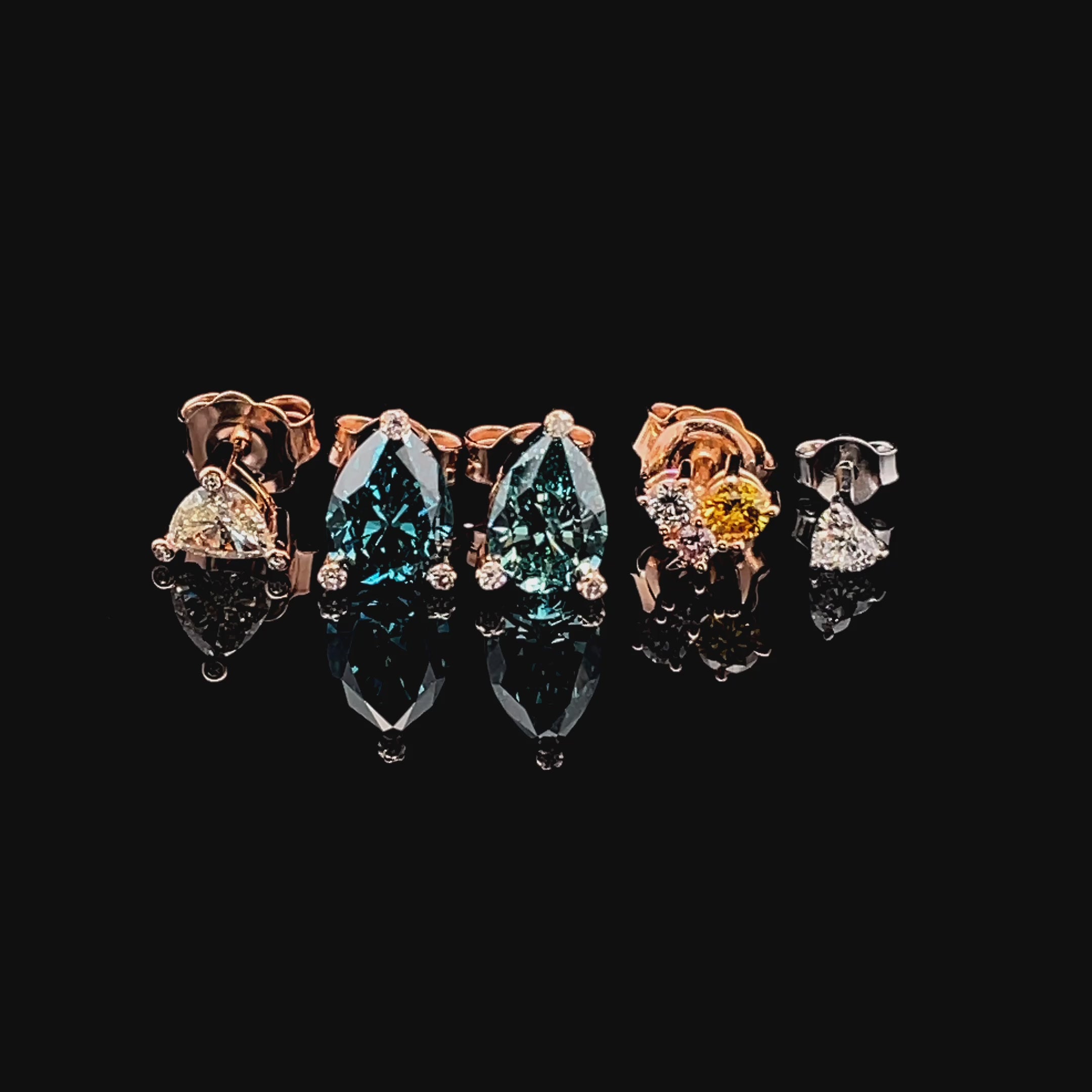 Trilogy of natural fancy coloured rounds. Pink, blue. Additional D colour for contrast. Subtle stud, handmade 18 kt yellow gold. 'Crypton' investment.