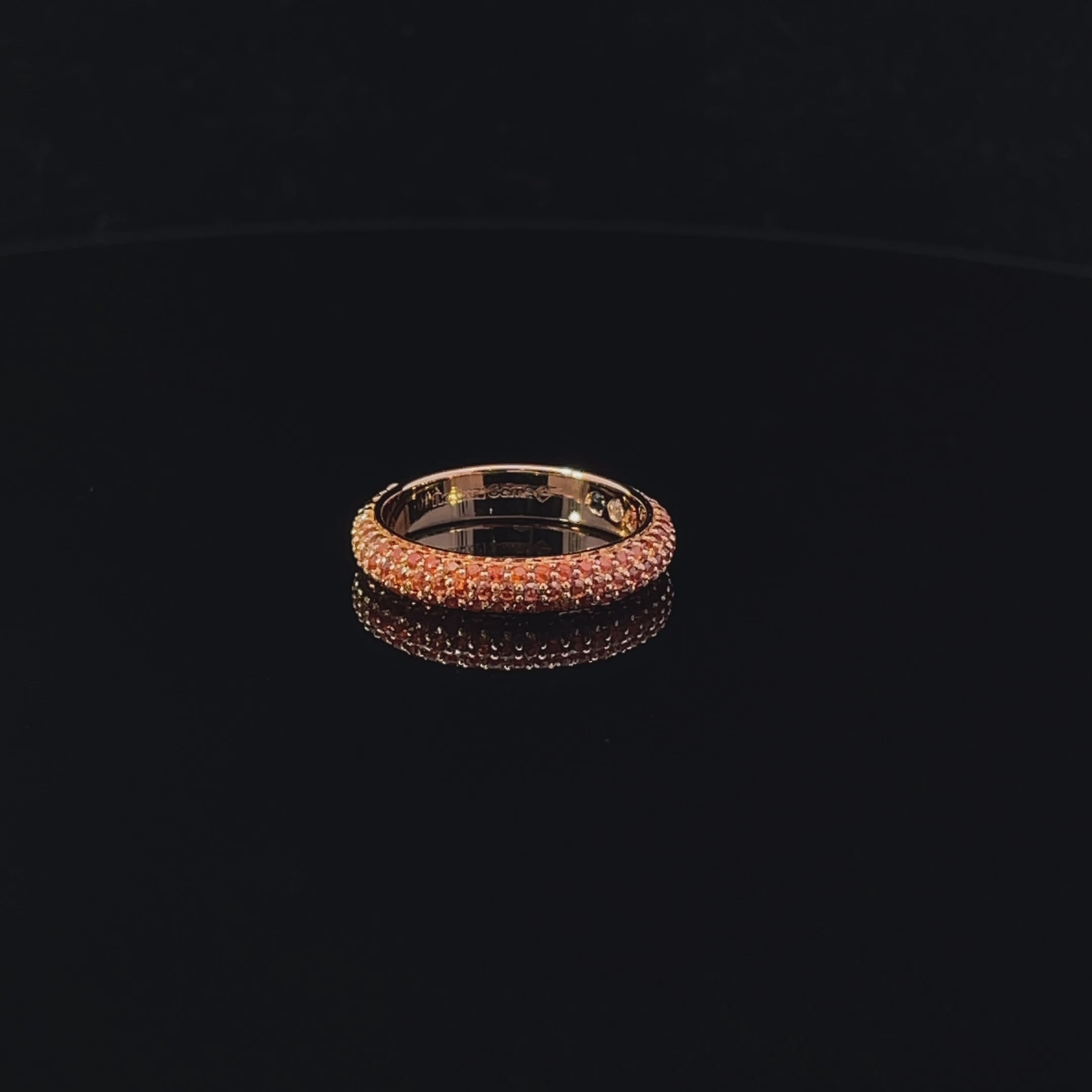 Natural orange and Padparadscha sapphires, blue sapphire + white diamonds finish, 1.3 mm. 3 row housestyle setting. Pink gold 18kt.